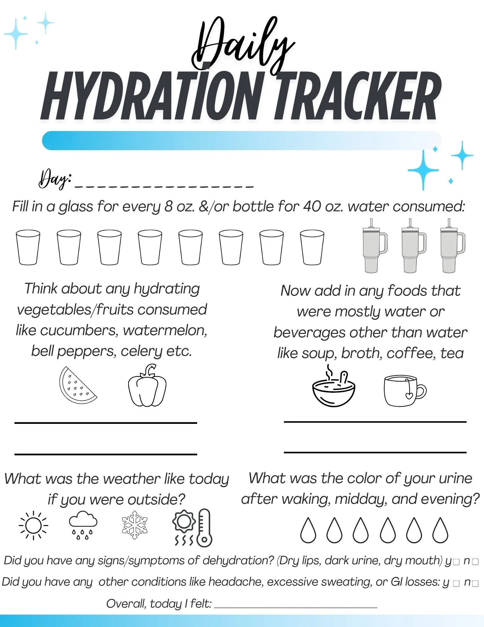 After completing all 7 days, transfer your data to the Hydration Tracker Summary Sheet and submit it via the official form to be entered into a random drawing.