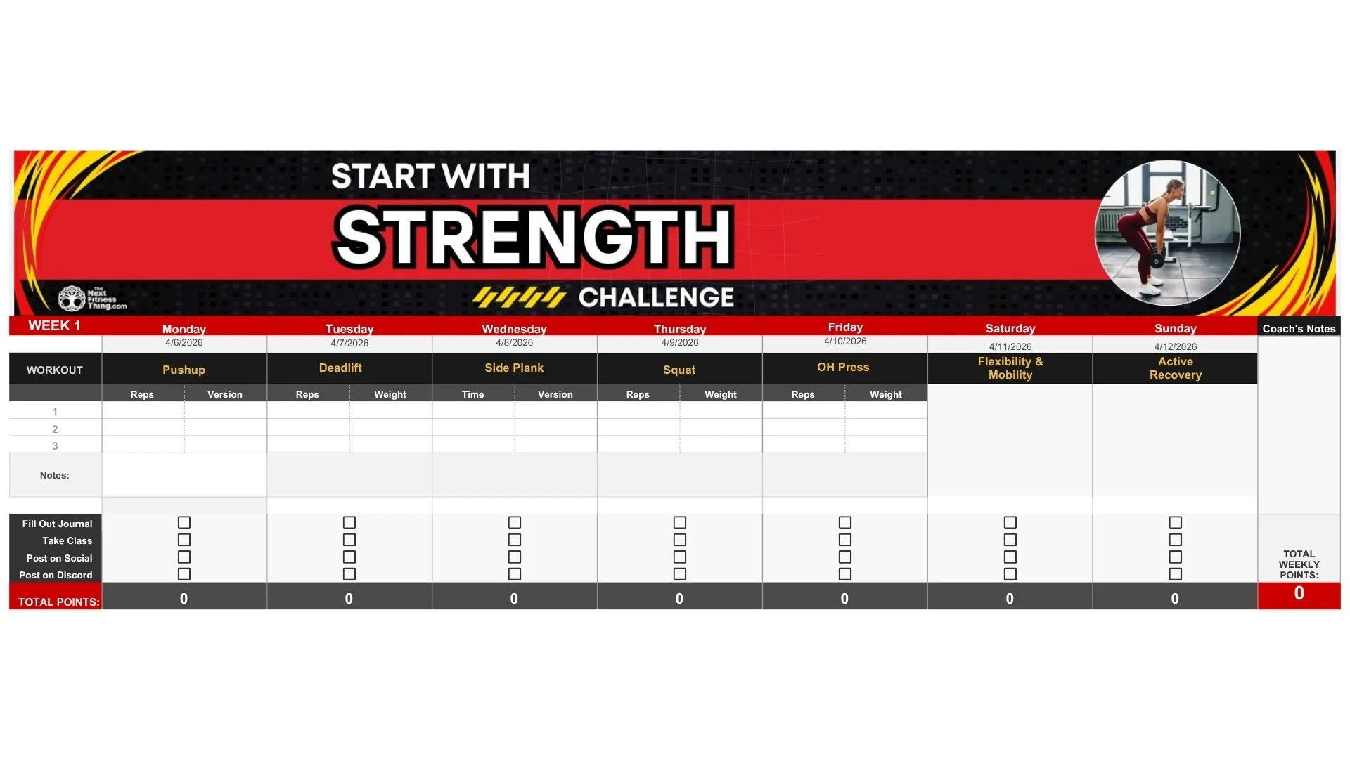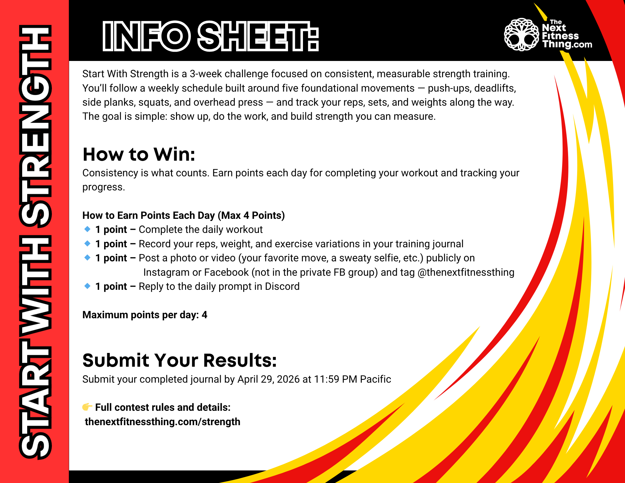 The Start With Strength Challenge (“Challenge”) is a 3-week fitness challenge hosted by The Next Fitness Thing, Inc. (“TNFT”). Participants earn points by completing daily activities as outlined below. The Challenge is intended for informational and recreational purposes only.
