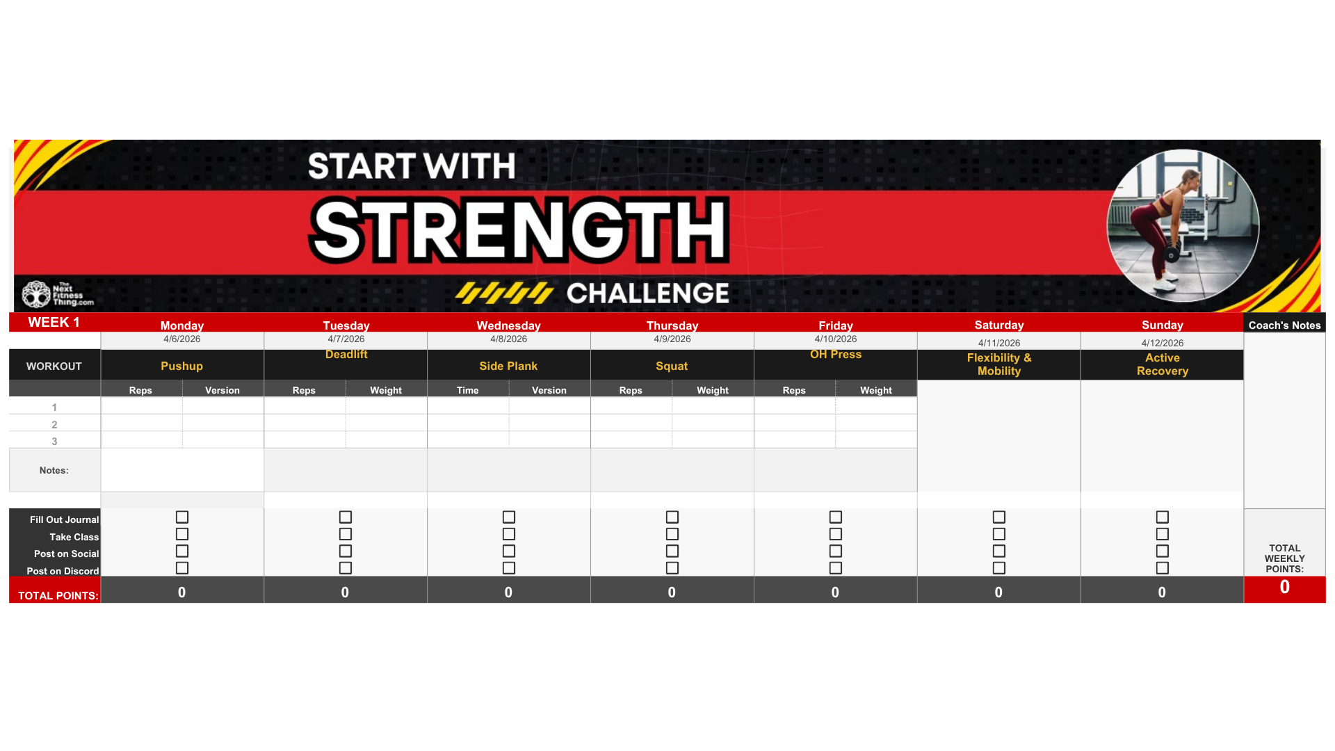 Start With Strength is a 3-week challenge centered on consistent, measurable strength training. You’ll track reps, sets, and weights and focus on steady progress.