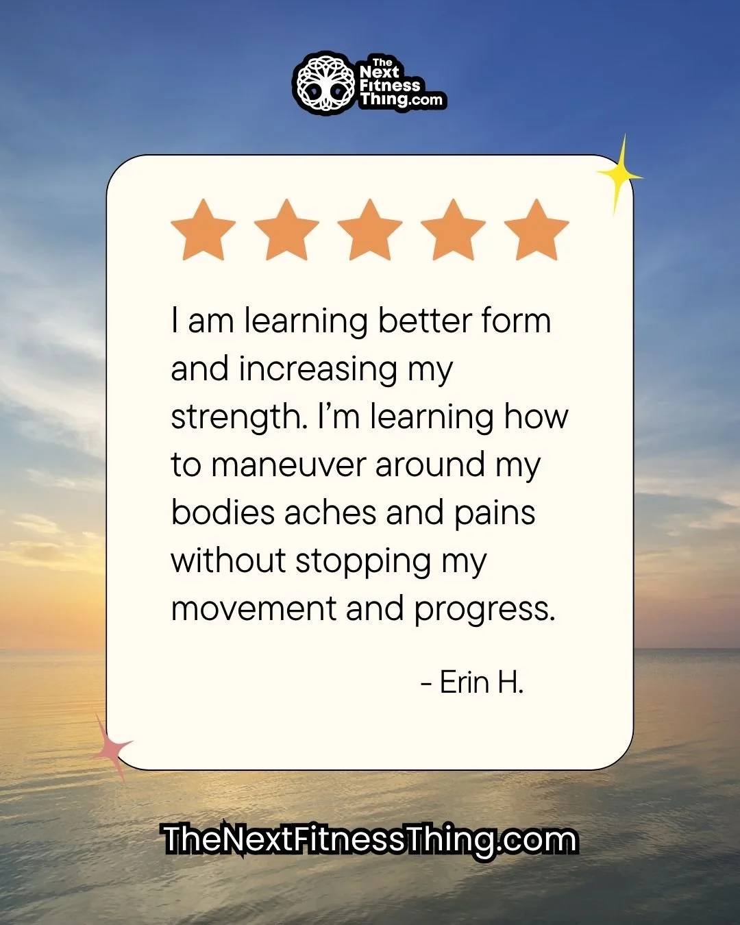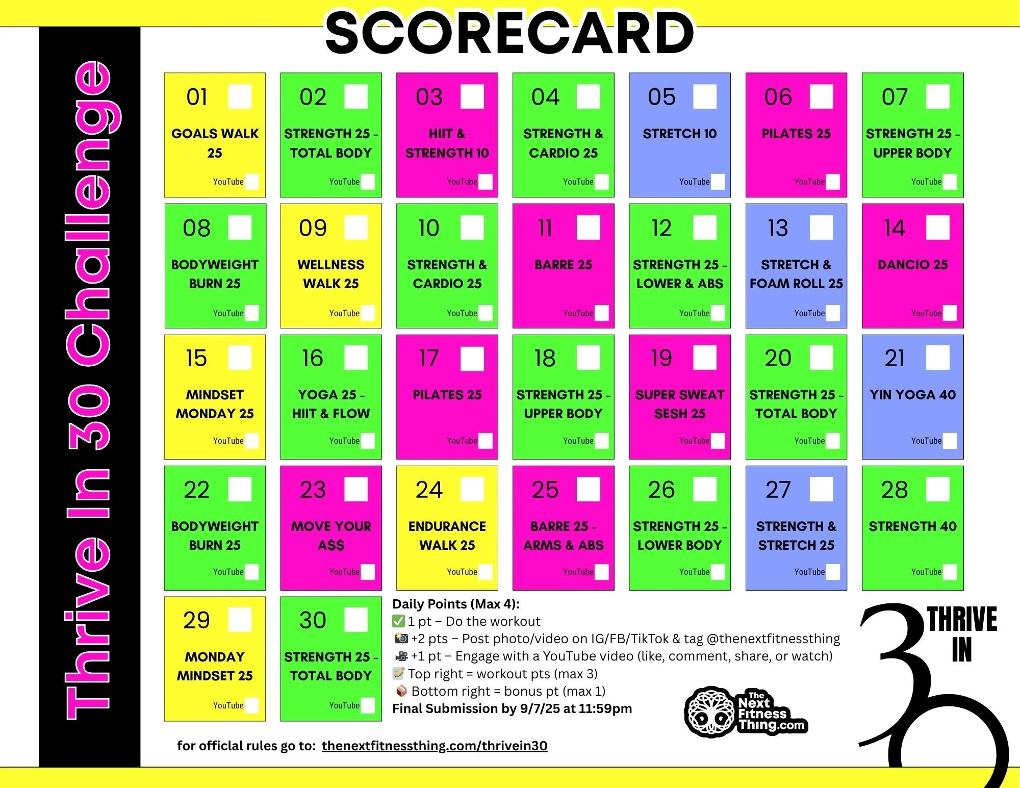 +2 points – Post a photo or video of your favorite move or a sweaty selfie publicly on Instagram, Facebook, or TikTok (not in the private Facebook group), and tag @thenextfitnessthing.